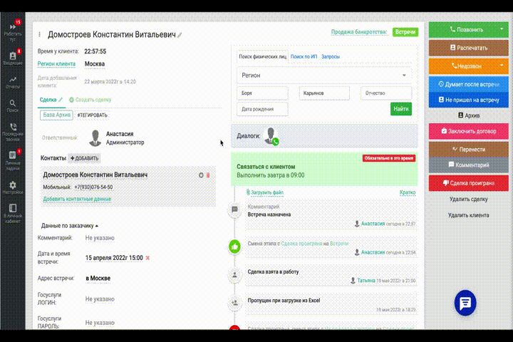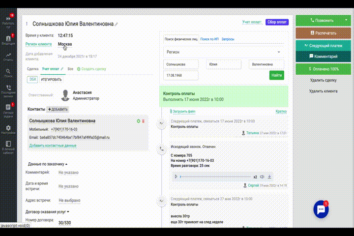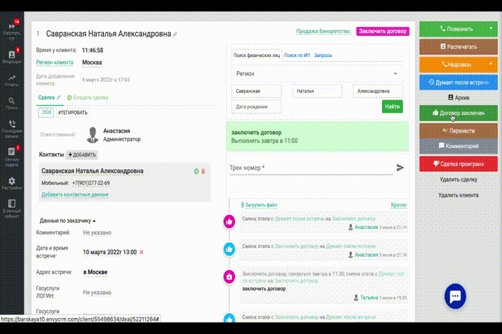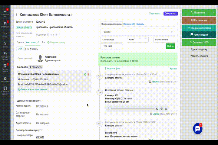 Переписка с клиентом в мессенджерах и соцсетях происходит внутри карточки клиента. Нет необходимости переходить на другие вкладки и устройства, что сокращает время ответа. Фиксируется вся переписка с клиентом, при смене сотрудника данные не будут утеряны и забыты.