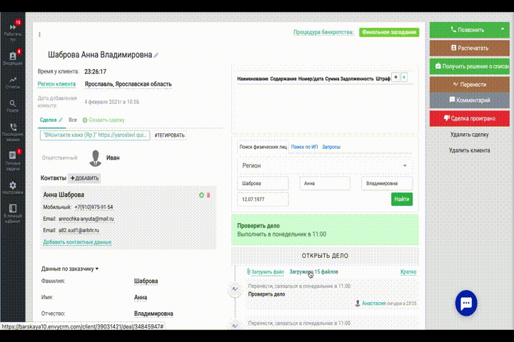 Составления графика платежей по рассрочке. Контроль внесенных оплат по каждому клиенту. Фиксация расходов по процедуре - госпошлина, депозит, почтовые расходы, расходы на публикации и торговые площадки. Доход, расход и прибыль.